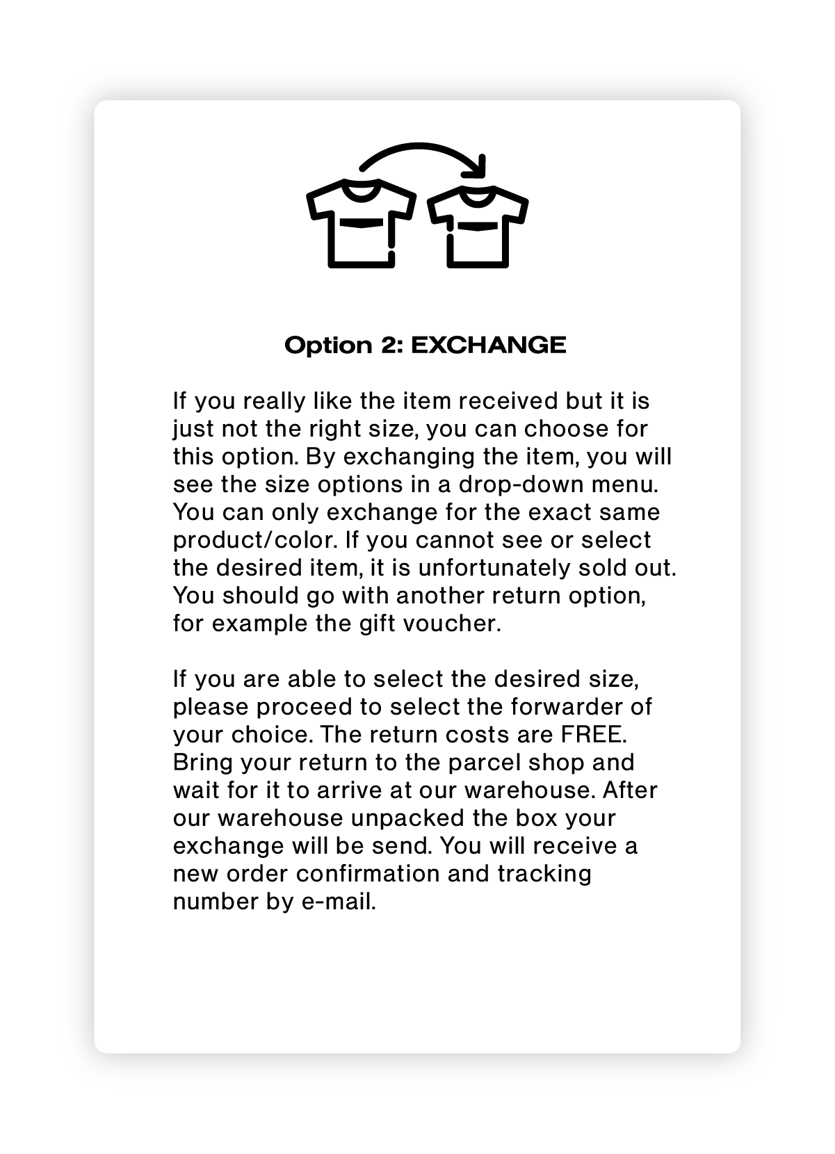 Los cambios por una Talla diferente son gratuitos para cada país. Recibirás una etiqueta de devolución prepagada.
