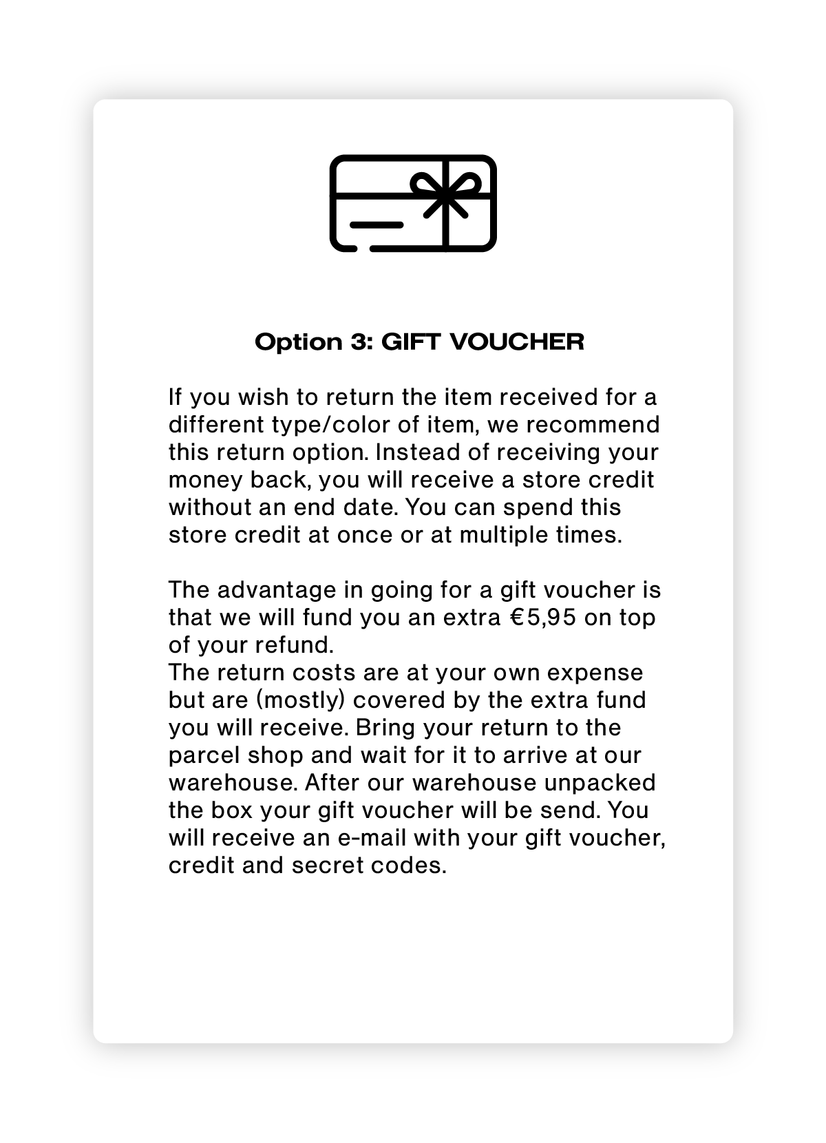 Tenemos una política de devoluciones que te beneficia tanto a ti como a nuestro planeta. Al devolver artículos, se aplica una tarifa de 5,40 euros (NL), que te permite devolver hasta 2 artículos sin coste adicional. ¿Quieres devolver más de 2 artículos? Por cada artículo adicional, pagarás una contribución de 0,99 euros.